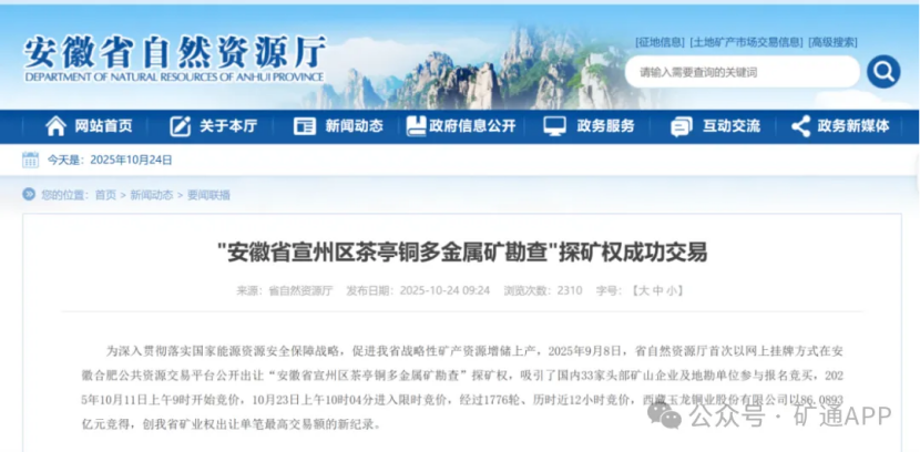 10月24日,据安徽省自然资源厅网站报道,经过1776轮、历时近12小时竞价,西藏玉龙铜业股份有限公司以86.0893亿元竞得,“安徽省宣州区茶亭铜多金属矿勘查”探矿权,创安徽省矿业权出让单笔最高交易额的新纪录。