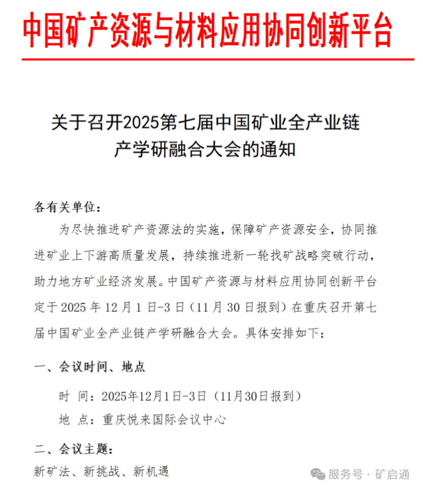 2025年12月1日至3日,第七届中国矿业全产业链产学研融合大会将于重庆悦来国际会议中心隆重举行。作为大会的核心会议之一——第四届中国矿业权投融资大会也将于12月1日亮相重庆悦来国际会议中心一楼欣悦A厅。本届论坛将由树人律师事务所和北京地心互动科技有限公司联合承办,以 “新矿法、新投资、新机遇” 为主题,紧扣政策变革脉络,深度解读矿业投资新逻辑,研讨矿企出海等企业发展新路径。会议还将精选优质矿权项目,为矿权人与投资者搭建高品质交流平台。