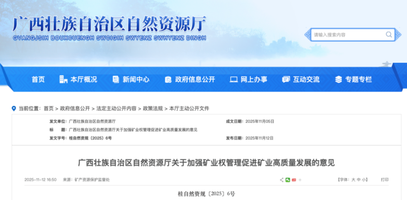 广西厅印发《关于加强矿业权管理促进矿业高质量发展的意见》,提高矿业权管理层级,严格矿业权准入和退出