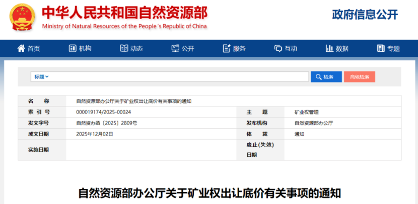 中国矿业报12月8日讯,自然资源部办公厅日前发布《关于矿业权出让底价有关事项的通知》(以下简称《通知》),对矿业权出让底价制定范围、参考依据、出让期间的保密管理工作等进行进一步明确。《通知》要求,以招标方式出让矿业权的、以拍卖和挂牌方式直接出让采矿权的,以及以拍卖、挂牌方式出让探矿权,非油气矿产已完成普查工作或油气矿产已完成圈闭预探工作的,均须确定矿业权出让底价。同时,矿业权出让底价不得低于矿业权出让起始价;在确定矿业权出让底价时,出让人可、委托矿业权评估机构进行评估,评估结果作为底价确定的重要参考;在竞争性出让时,未成交的矿业权再次出让的,可对矿业权出让底价进行上浮或下调。《通知》强调,矿业权出让底价在出让交易活动结束前须保密且不得变更。据悉,《通知》将于2026年1月1日起开始实施。