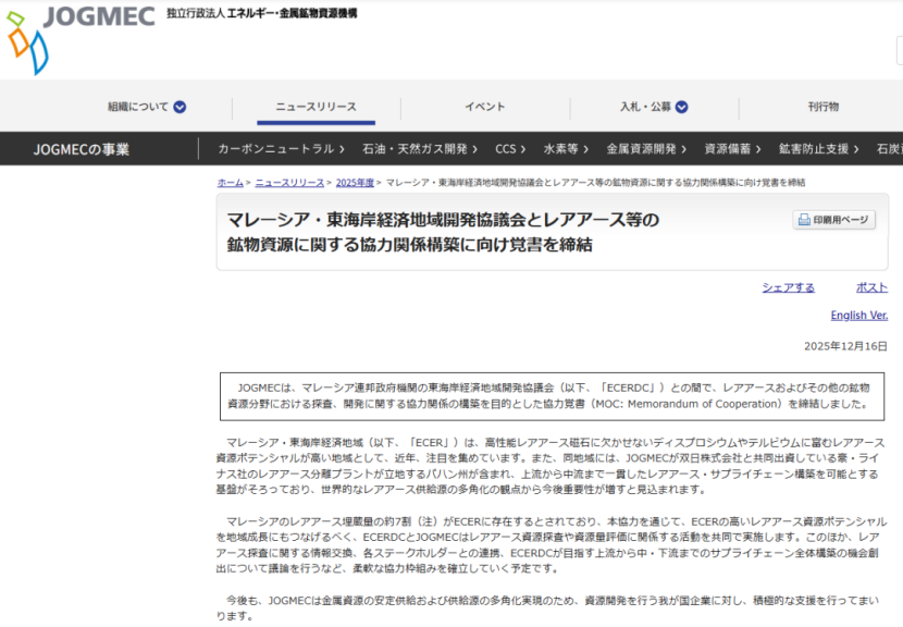 日本能源和金属矿产资源机构官网12月16日讯,日本能源和金属矿产资源机构(JOGMEC)日前表示,已与马来西亚东海岸经济区发展理事会签署谅解备忘录,将加强在西马半岛东海岸经济特区稀土及其他矿产资源勘探与开发方面的技术合作。根据合作协议,日本将为马来西亚提供地质勘探、资源评价等关键技术支持,同时开展人才培训和能力建设,首批合作项目预计将在吉兰丹州启动。马来西亚则开放东海岸经济特区的稀土资源开发权,希望借助日本技术打通“勘探-开采-加工”的上游产业链。据悉,双方目标不止于初级开采,马来西亚首相安华此前曾明确表示,欢迎日本参与全产业链投资,从可持续采矿到高附加值产品生产,到开展联合研发,以求打造完整的稀土产业生态。目前,东海岸经济特区已吸引澳大利亚莱纳斯公司扩建加工厂,规划中的钕铁硼永磁体工厂也将于2027年前后投产,两国的合作有望进一步完善这一产业布局。根据官方数据,马来西亚稀土储量约为1610万公吨,主要分布在登州、丹州、彭亨、霹雳和吉打。当地稀土种类齐全,所有17种稀土元素都有,但缺乏开采和加工技术,因此开采量较少,且高度依赖外国技术。有分析称,双方的合作既瞄准了马来西亚丰富的稀土储量,也精准对接日本技术优势,在全球稀土供应链格局相对固定的背景下,或将引发业界对区域产业重构的关注。