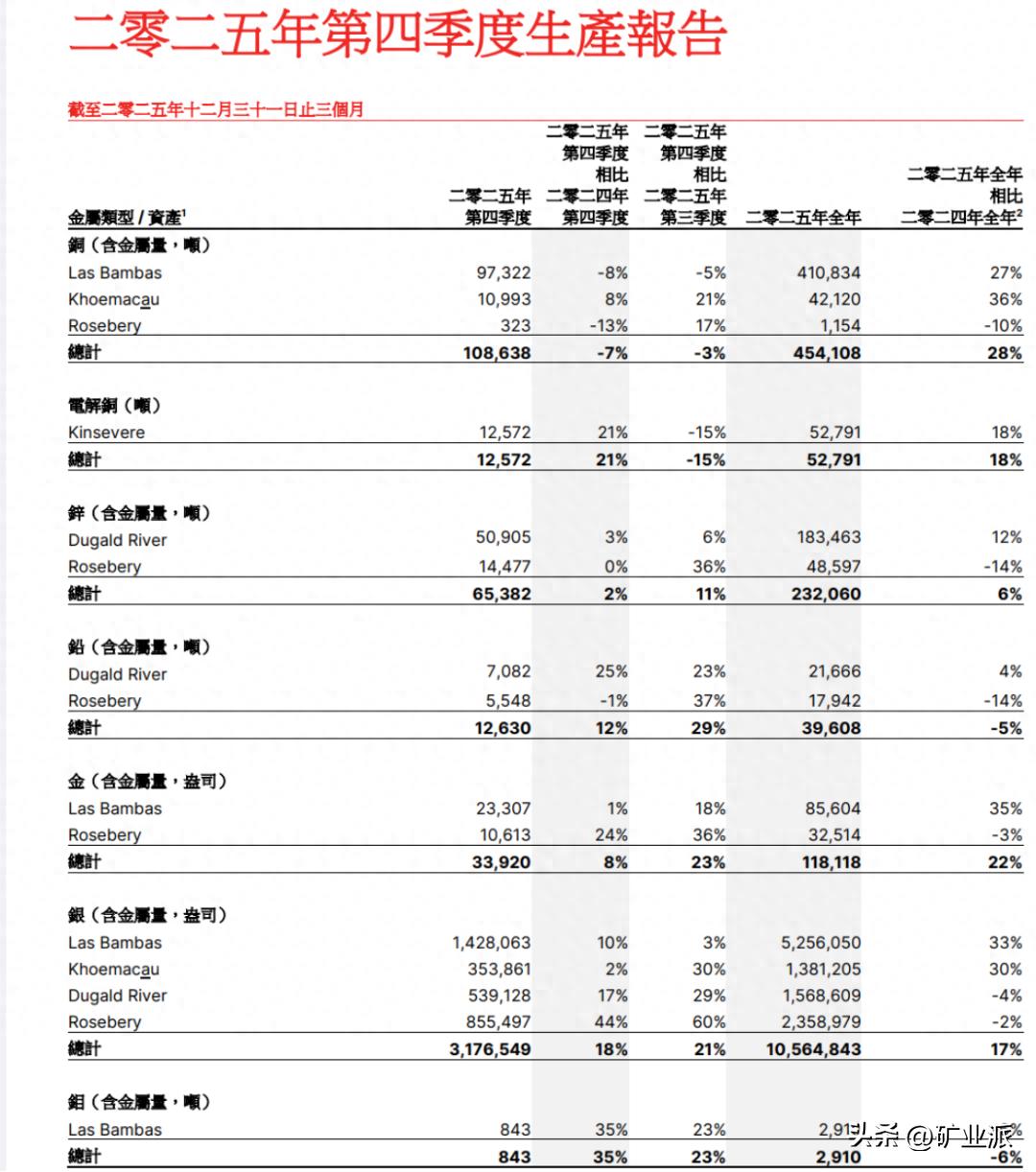 铜板块,五矿资源铜产量(含电解铜)50.7万吨,同比增长27%,创下2018年以来新高。其中核心矿山,位于秘鲁的拉斯邦巴斯铜矿2025年创下投产以来的第二高纪录,达到41.08万吨,同比增长27%。